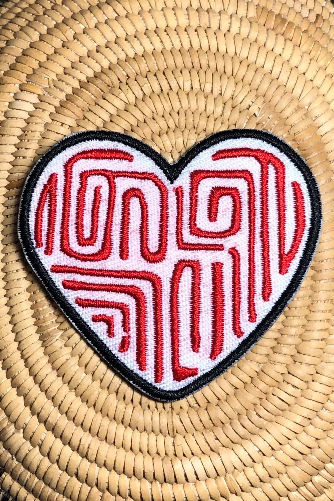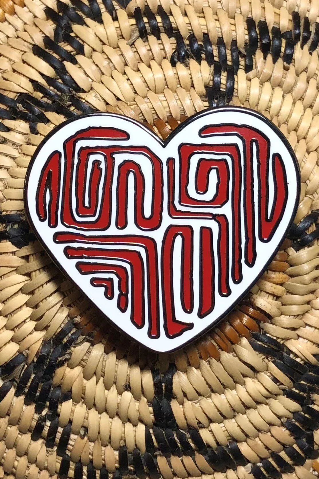 “No$úun” is the Luiseño word for (My) Heart. This design was created as a Linocut ink print in 2020 as a love letter to my family, to my tribe, and to the Luiseño people. The heart was designed after the style of the Luiseño pictograph mazes that were painted in red ochre on the sides of boulders, a style of pictographs distinct to the Southern California region. My intention with this design is to create a symbol that represents the heart of the Payómkawiichum, the People of the West.